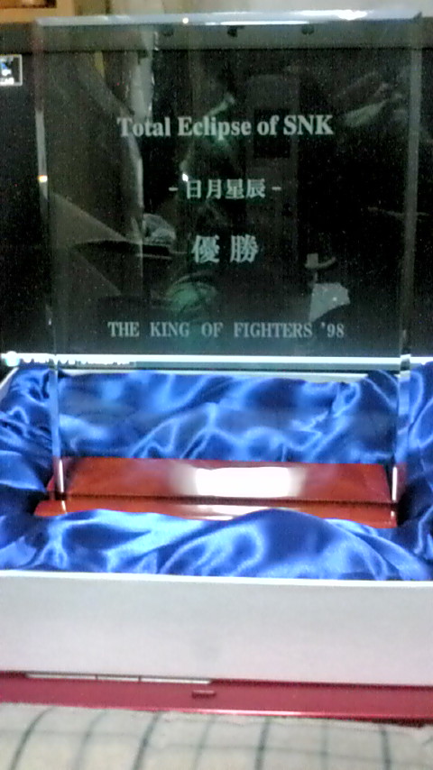 重厚なガラス製の楯です。画像はKOF98となっておりますが、三種目全てにご用意いたしました。